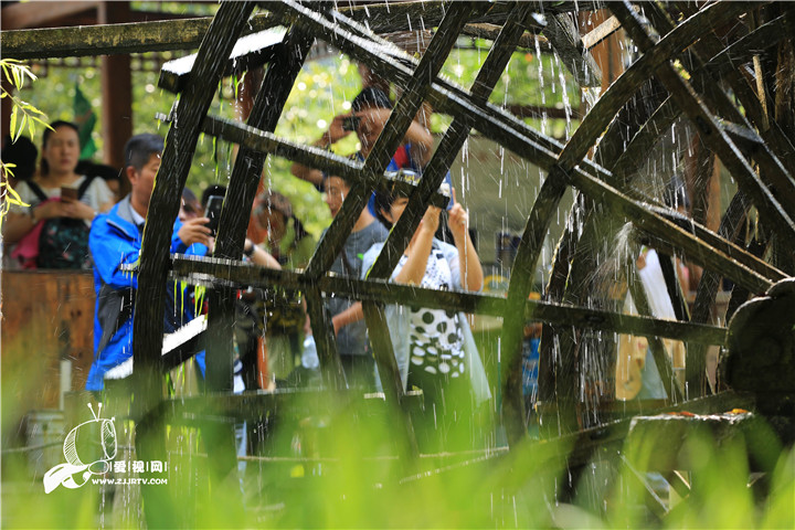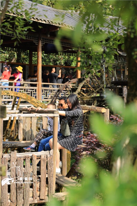 10月5日,游人在欣赏黄龙洞景区的水车景观