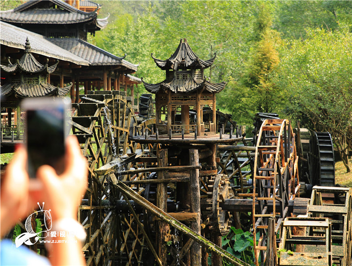 10月5日,一名游人用手机拍摄黄龙洞景区的水车景观
