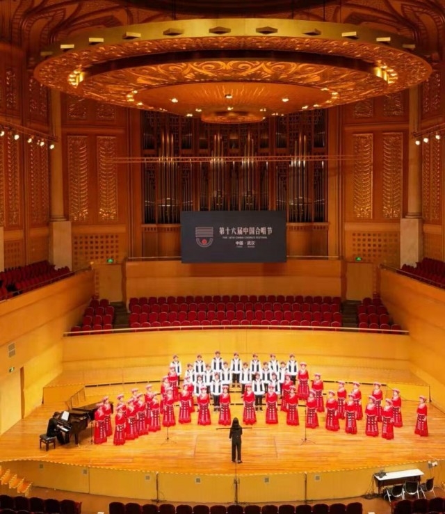 7月6日上午11点,可容纳1800名观众的武汉琴台音乐厅,50名平均年龄63.5岁的张家界市山水情老干部合唱团的演员们,身着鲜艳的土家族服装登上舞台,他们满怀深情演唱《唱支新歌给党听》《身身 身身歌》(苗语,发音nia nia)两首歌曲,尤其是第二首无伴奏合唱,充分发挥男女不同声部、声区、音色的表现力,同时加入了苗鼓、人声模拟动物之声,惊艳全场,刚一唱毕,台下掌声雷动,久久不散。张家界市山水情老干部合唱团成立于2018年12月,成员来自于市区各个单位的退休人员。今年是建党100周年,3月初,中国合唱协会将在武汉举行中国合唱节的消息传出,张家界学院刘奎宏老师(刘奎宏,中国合唱协会会员,湖南省高校合唱委员会副秘书长,张家界学院室内混声合唱团常任指挥艺术总监)热情鼓励合唱团参加这次全国比赛,并把自己改编独创作品《身身 身身歌》授权山水情合唱团演唱。团长杨中汉虽然已经年过七十,但热情高涨,为组织这次参赛学习费尽了心血,团员们也克服了家务事繁多、天热高温、歌曲难度大的困难,坚持学习排练,并自费赴武汉参加比赛。