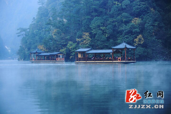 红网张家界分站11月28日讯(通讯员 吴勇兵)11月28日晨,湖南张家界武陵源宝峰湖风景区,轻绕的薄雾,慢行的游船,悠然的天鹅,构成一幅和谐美妙的冬日生态画卷。