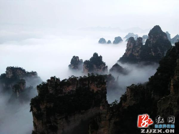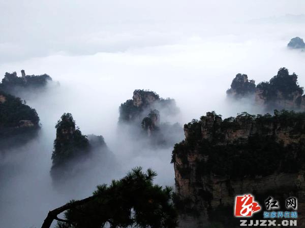由于近段时间雨雾天气较多,雨住风起之时,武陵源各大景区便会被一层厚厚的白云萦绕,呈现的风景若仙若幻,令人心旷神怡。杨家界地处武陵源的西北部,以峰墙景观著称世界,而云海中的峰墙更为景区增添了一份神秘色彩。“这是我今年看到的最漂亮的云海!”一位长期在杨家界天波府守云的摄影人如是说。