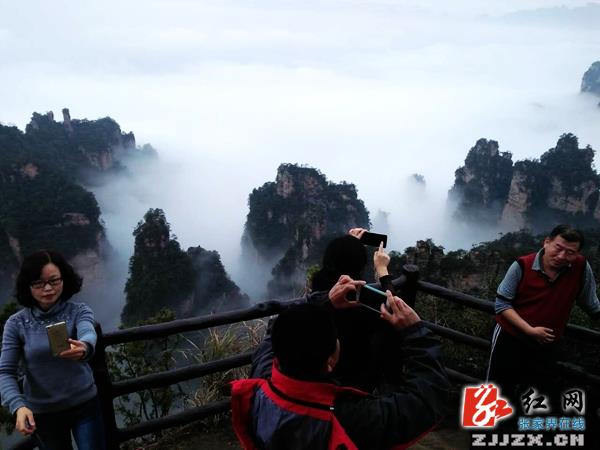 红网张家界站11月21日讯(通讯员 邓道理 毛建军)冬游张家界,云海涌起来。11月21日清晨,张家界核心景区武陵源杨家界“天然长城”景点一带出现神奇壮观的云海风光,让前来参观“张家界地貌”峰墙美景的游客陶醉其间,欢乐不已。