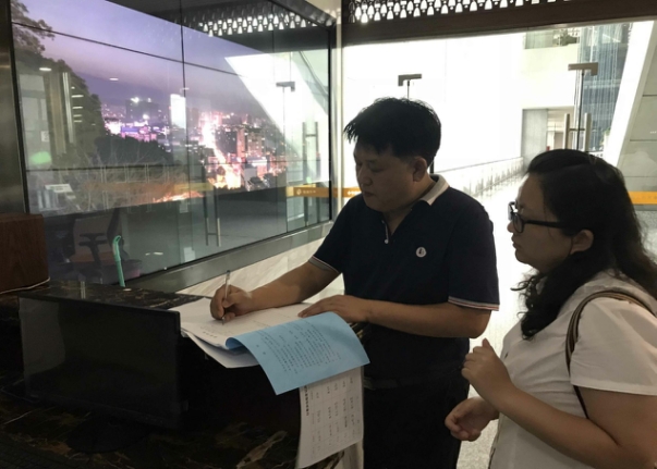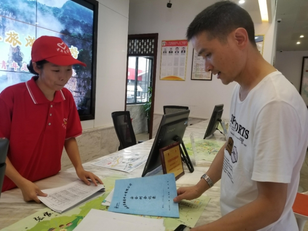 游客中心总经理罗万琼在机场门店检查门店安全台账