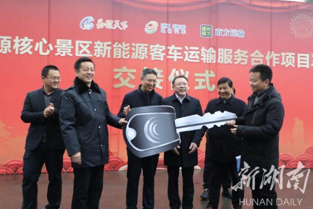 当天上午,武陵源核心景区新能源客车运输服务合作项目车辆交接仪式在梓木岗停车场举行。由国网(湖南)电动汽车服务公司、张家界易程天下环保客运有限公司和南方运输公司共同引入8台新能源纯电动客车正式投入运营。