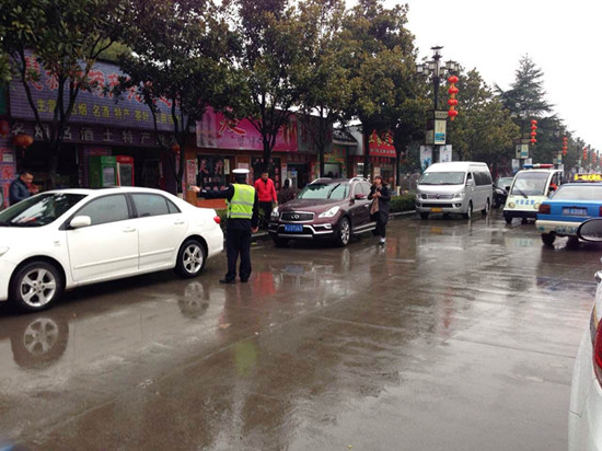 张家界市交警二大队全体民警在车流中穿梭,在风雨中执勤,积极疏导交通,防止交通拥堵现象发生,确保雨天辖区道路安全畅通,获得广大游客的一致好评。