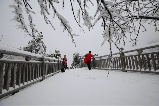 武陵源天子山迎来初春的瑞雪,万千峰林披上美丽白裳,分外妖娆,吸引各地游客前来欣赏雪景。