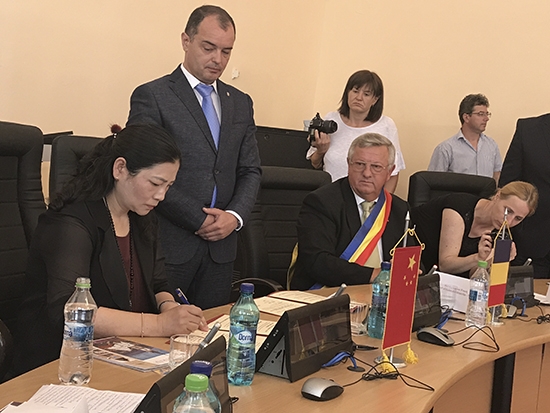 7月11日上午,在罗马尼亚比斯特里察市政府议政大厅奏响了中华人民共和国国歌和罗马尼亚国歌,在罗马尼亚中央特派员、双方代表及罗马尼亚多家媒体的见证下,张家界市与比斯特里察市签订了友好城市合作意向书。
