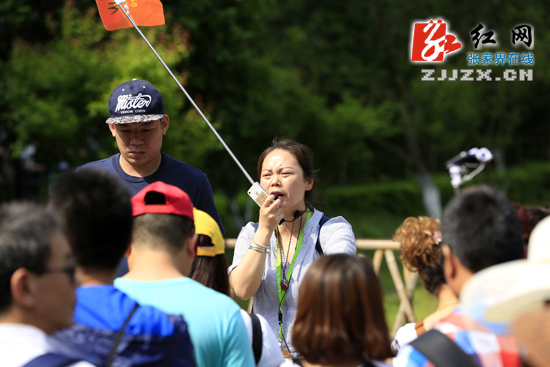 一名导游在黄石寨景区为游客讲解线路,常年辛苦奔忙在景区的导游,是张家界旅游形象的宣传使者。(吴勇兵 摄 资料图)