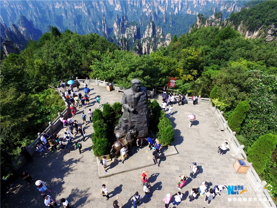 武陵源贺龙公园里的贺龙铜像,屹立在“云青岩”上,背负青山,面壁神堂湾,凝重、庄严、和谐地统一在青山绿水的画图中新华网王超摄