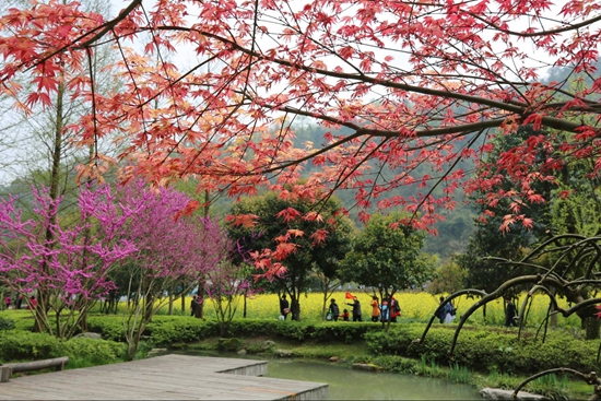 赏红枫叶非要在秋天吗?在湖南张家界黄龙洞风景区生态广场,春天反季节也能欣赏到火红的枫叶。清明节前夕,黄龙洞风景区生态广场的枫树初展出的娇嫩枫叶红似火,点缀在绿柳春花间,绚丽多彩,吸引各地游客前来欣赏春天的“红枫秋色”。