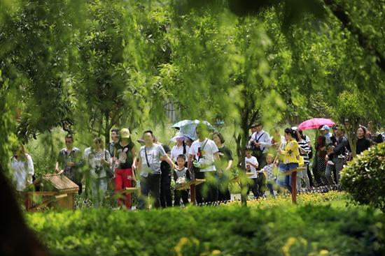游人在张家界黄龙洞景区生态广场游玩(吴勇兵 摄)