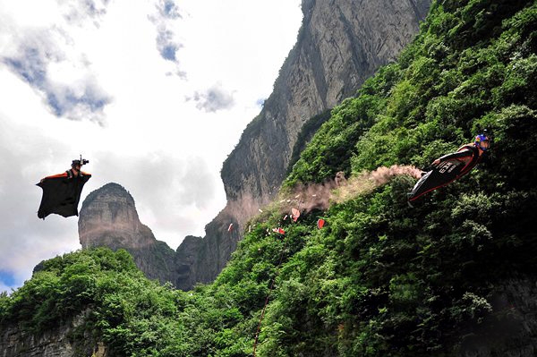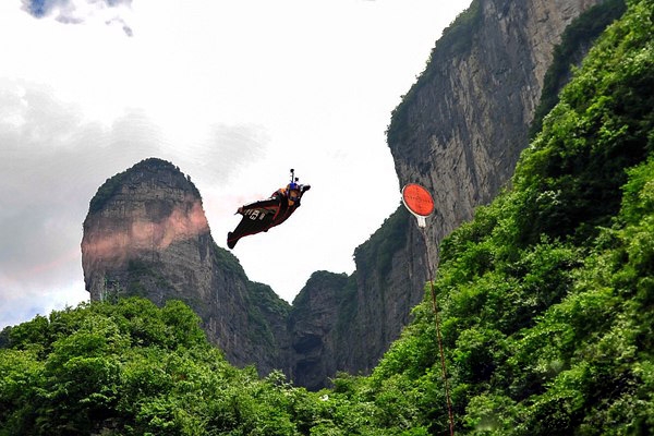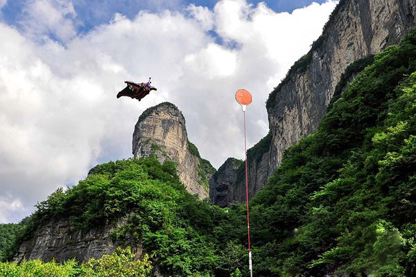 海拔1400余米的天门山鲲鹏顶,一个黑影从悬崖绝顶纵身一跃,展翅、贴着岩壁急速飞行、S形大转弯、目标空中移动靶……随着“啪”的一声脆响,移动靶标瞬间粉碎,黑影穿靶而过,掌声惊叹声此起彼伏。