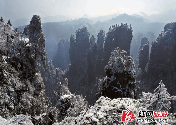 ??在张家界的山岳景区,冬季气温可达零下5℃左右,一场大雪后,一般可保持半个月的冰雪奇观。在世界罕见的石英砂岩峰林峡谷中,大自然运用雨、雾、雪、云、阳光的妙笔,描绘出绝美的仙境。黄石寨、天子山、袁家界、杨家界、天门山等景区是欣赏冰雪奇观的绝佳之地,这样的琉璃王国,你只有身临其境才能感受得到。