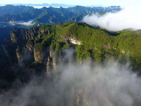 武陵源天子山风景区出现波澜壮阔的云海景观。白白的云雾飘逸在连绵峰峦间,如梦似幻,场景十分壮观。