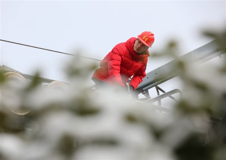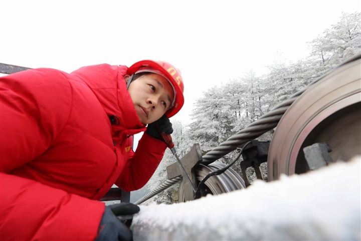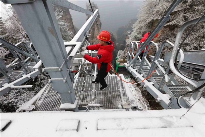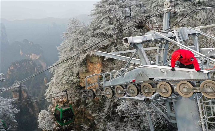 2020年12月30日,湖南张家界武陵源景区黄石寨索道巡检员在检查索道运行设施。受寒潮影响,湖南张家界市武陵源区高海拔山区出现低温降雪天气。当地景区管理部门采取多种措施做好防范应对工作,加强对高空索道等游览设施的安全检查和维护,排除因低温冰雪天气带来的安全隐患,确保旅游接待安全。