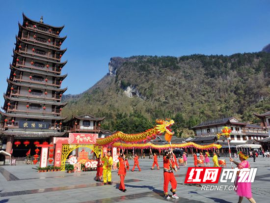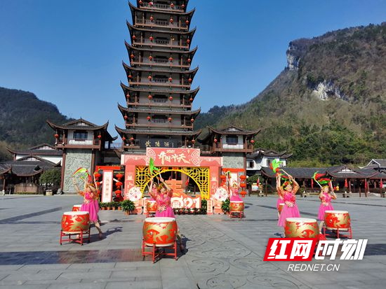 2月12日正月初一,武陵源吴家峪门票站广场锣鼓喧天,热闹非凡,舞龙灯、唱阳戏、敲龙鼓......一波波原汁原味的土家民俗表演,喜迎牛年,牛气冲天!有的客人或用手机拍照,有的客人全神贯注观看表演,还有的客人跃跃欲试参与其中,整个广场充满了浓厚的春节喜庆氛围,让游客们体验到了不一样的土家“年味”。