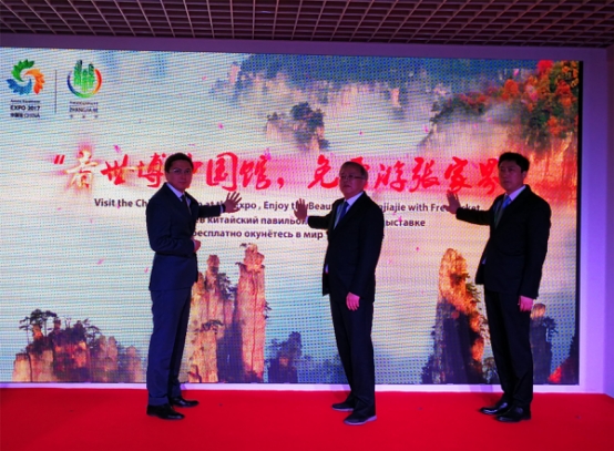 阿斯塔纳当地时间7月18日上午,张家界成为阿斯塔纳世博会中国馆的亮丽名片,展示在世界面前。当天上午举行的阿斯塔纳世博会中国馆湖南活动周启动仪式上,200多名中外嘉宾云集。作为启动仪式的重要议程,播放了11分钟的张家界绝美风光和民俗风情专题片,令中外嘉宾连连称赞;张家界桑植民歌组合歌梅拉演唱的国家非物质文化遗产桑植民歌《马桑树儿搭灯台》、《九岭十八岗》,赢得阵阵喝彩;张家界副市长欧阳斌推介张家界世界自然遗产世界地质公园后,由湖南省政协副主席欧阳斌、中国国际商会秘书长于健龙、哈萨克斯坦投资合作署署长艾登等共同启动了“看世博中国馆,免票游张家界”活动。