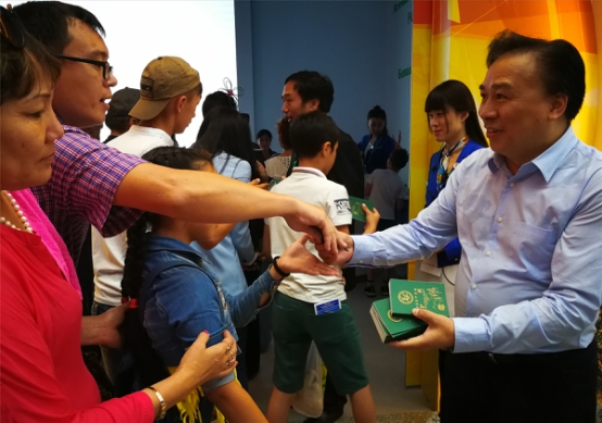 副市长欧阳斌(左)在中国馆入口处为世博会游客发放张家界集邮旅游护照