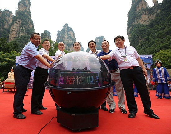 绝版张家界,直播惊世界。6月29日上午,随着张家界市委副书记刘革安一声令下,张家界市人民政府副市长欧阳斌、李培其等领导共同触摸启动球,“绝版张家界·直播惊世界——第二届中国张家界民俗文化活动月暨首届国际网红直播旅游节开幕式‘千人狂欢大摆手’活动”,在张家界市武陵源核心景区水绕四门广场正式拉开帷幕,同时也意味着张家界正式进入“全民直播”时代。
