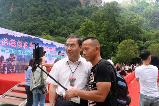 活动现场,张家界市委副书记刘革安(左)与现场直播网红互动 (谷婧文 摄)